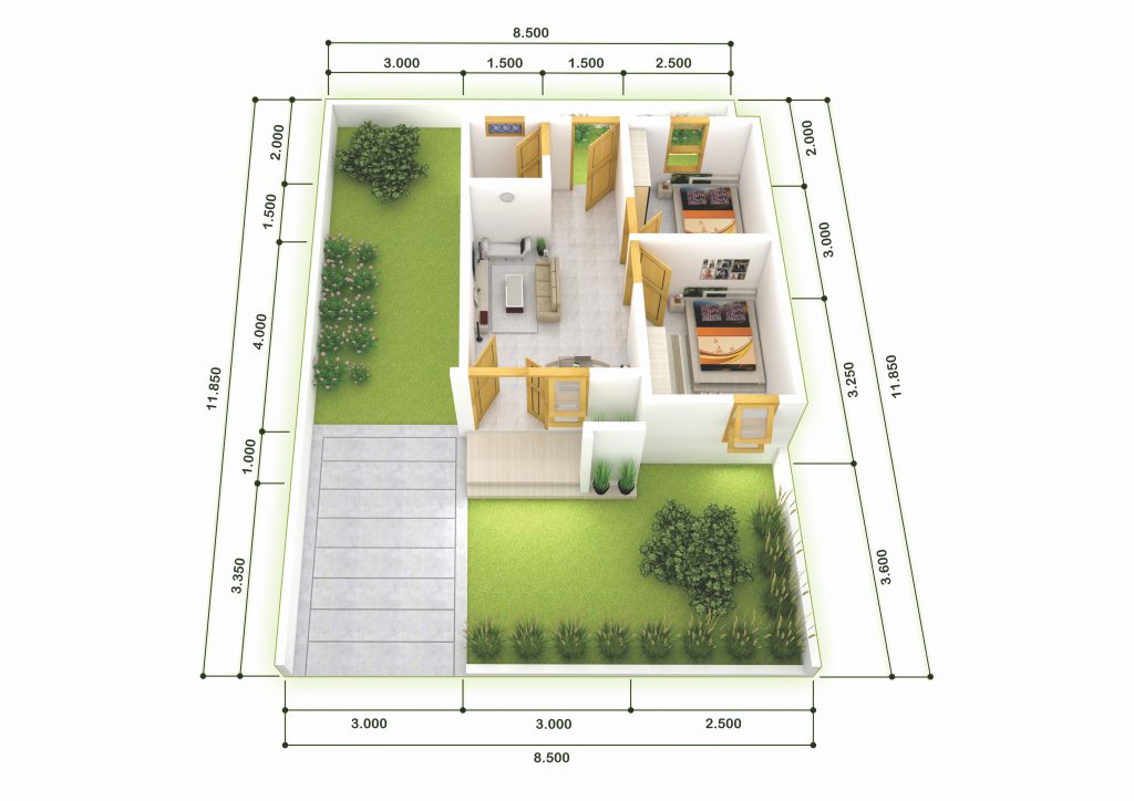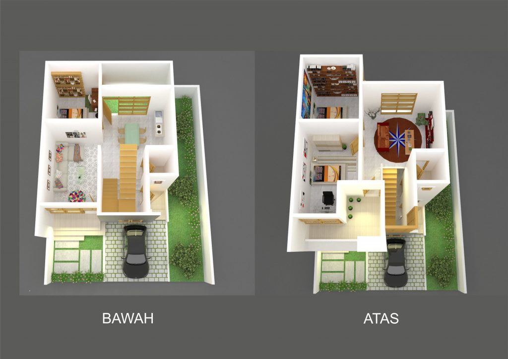 Desain rumah berikut sangat kompleks dan simpel, pasalnya dengan lahan yang tidak terlalu luas sahabat dapat memiliki 2 kamar tidur, ruang keluarga, dapur sekaligus space untuk meja makan dan kamar mandi. Untuk bagian luar masih terdapat carport, taman dan teras.